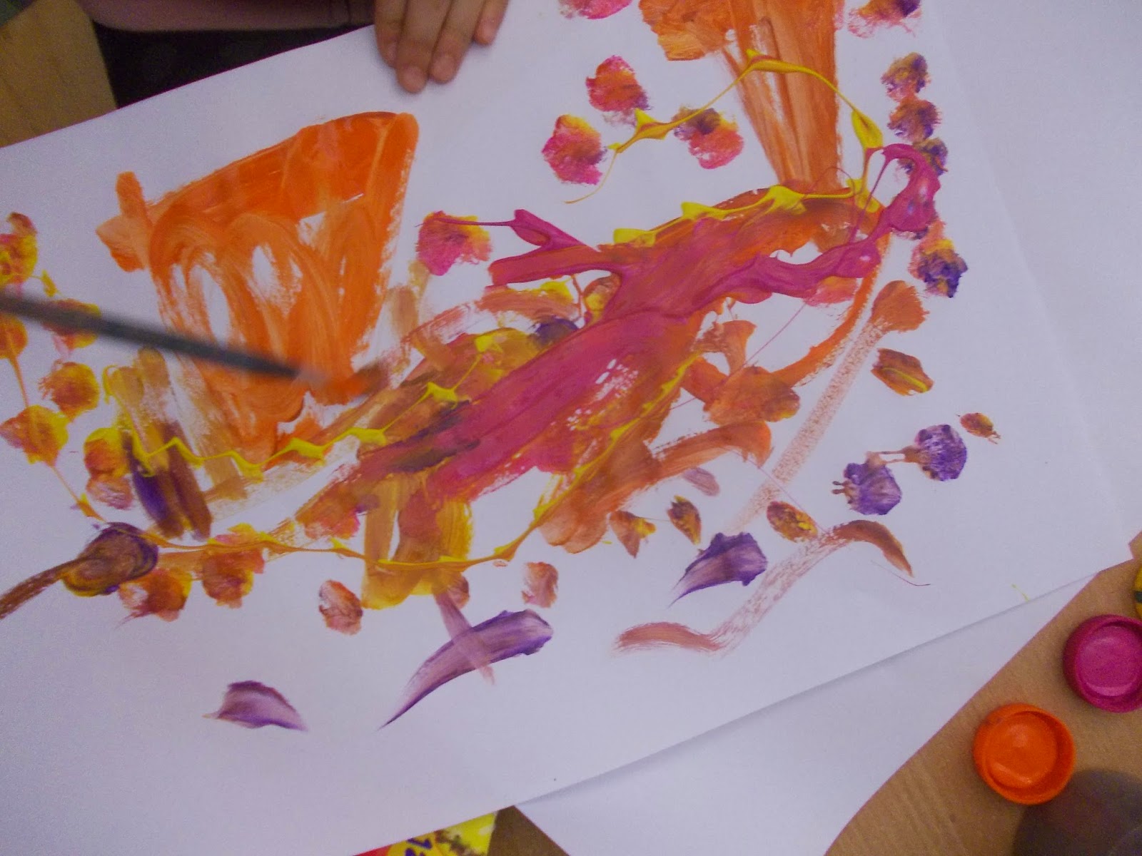 TASK: During these past few weeks we have been dealing with geometry, different math tasks that require spatial imagination. Thus our art lessons were devoted to painting and drawing using lines of symmetry. The students' task was to fold a piece of paper, unfold it and just in the middle (on the fold line) put a drop of their favorite paint. Next they had to fold the piece of paper again, use their hands to make the paint spread all over the area. In the end they unfolded the piece of paper to reveal the picture. They tried to guess what it might show. Moreover, they made some prints of their paintings.