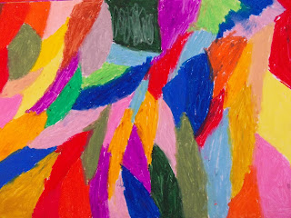 During our last few art classes we have been working on an art project focused on creating a scratch-off drawing. It is a nice technique, very much liked by the children due to the fact that it is pretty easy to use (even though a little time-consuming, since preparing the sheet takes much of the classroom time). The media/tools used to make a picture are as follows: oil pastels, black paint or ink, a wooden stick or a plastic fork, a sheet of construction paper. We used a larger piece of paper, however the smaller sheets are quicker to fill with color. To cover the sheet with color we used oil pastels. They are a great medium that allows you to cover the entire piece of paper in considerably short period of time. What is more, they allow you to blend the colors, and thus create the hues by overlapping strokes of different colors or simply get new shades of the same color. It is important to cover the whole space of the sheet of paper, making sure that the patches join together, not leaving any white spaces between them. When the entire sheet is coated with colorful patches (like I said - mixing colors is much welcome), the next step is to put the final coat of black paint on top of the picture (cover the oil pastel patches completely with black paint or ink). Then you need to leave the paint until it is dry. Finally, you take a wood stick or you simply use your finger (the black paint scratches away easily) to reveal spectacular rainbow colors underneath. You may get amazing effects revealing intriguing and distinctive patterns. You can also scratch the design through the wet paint.